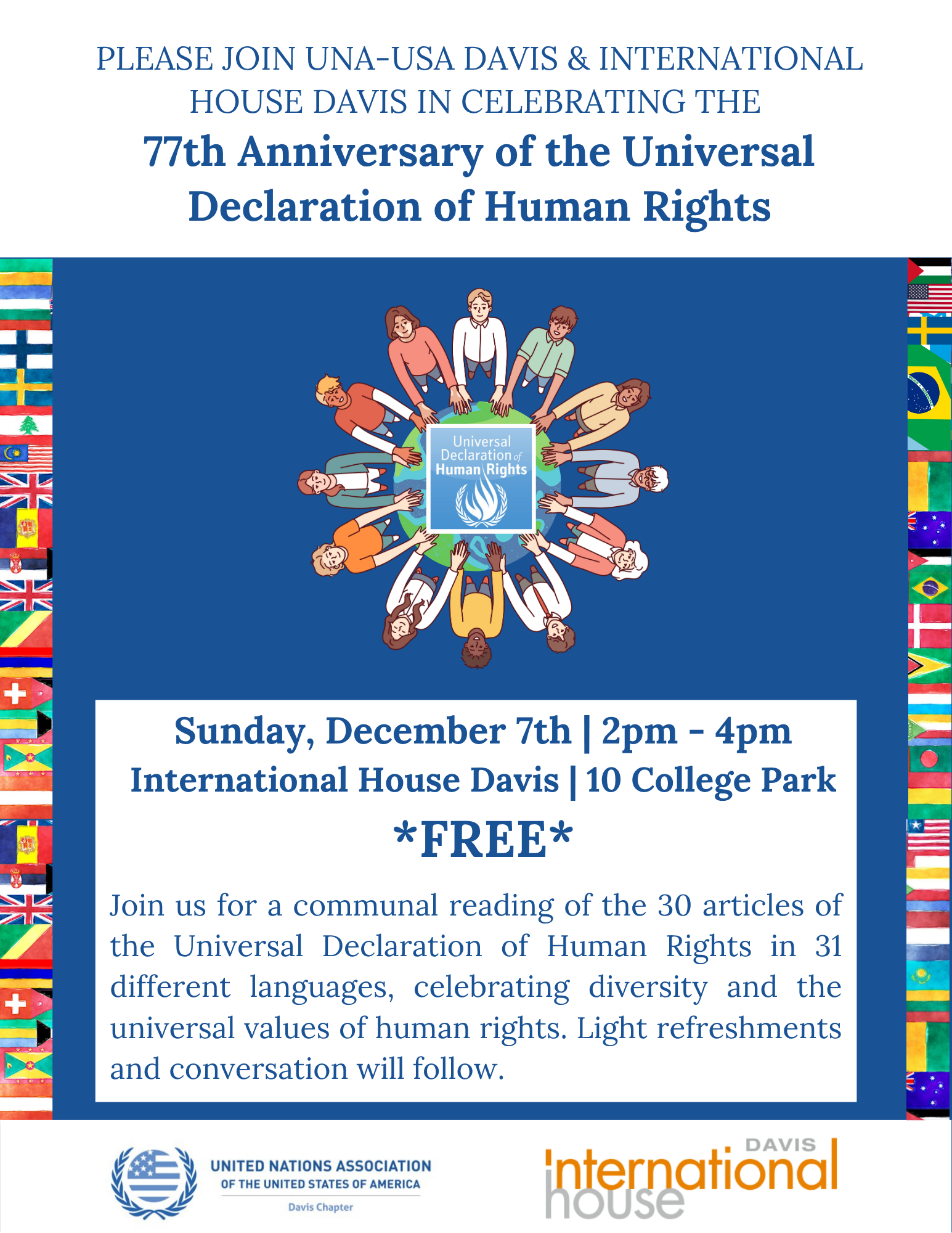 Join us for a communal reading of the 30 articles of the Universal Declaration of Human Rights in 31 different languages, celebrating diversity and the universal values of human rights. Light refreshments and conversation will follow. No RSVP Required.